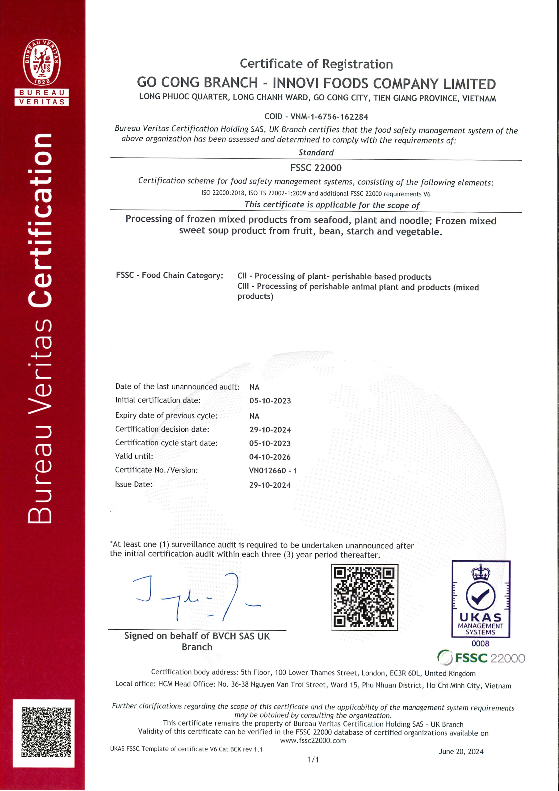 Hoàn thiện hệ thống quản lý chất lượng theo HACCP; Đạt chứng nhận hệ thống chất lượng FSSC 22000 được GFSI công nhận.